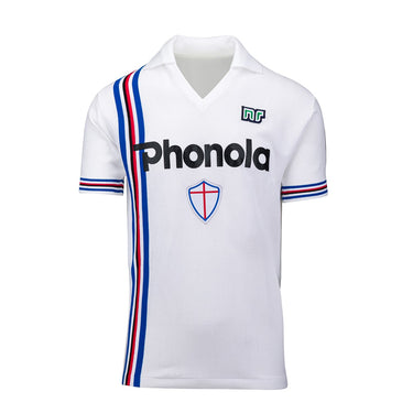 Realizzata in Italia, questa divisa bianca è caratterizzata dal prestigioso sponsor PHONOLA e dalla croce di San Giorgio, simboli distintivi dell'epoca dorata del club genovese.