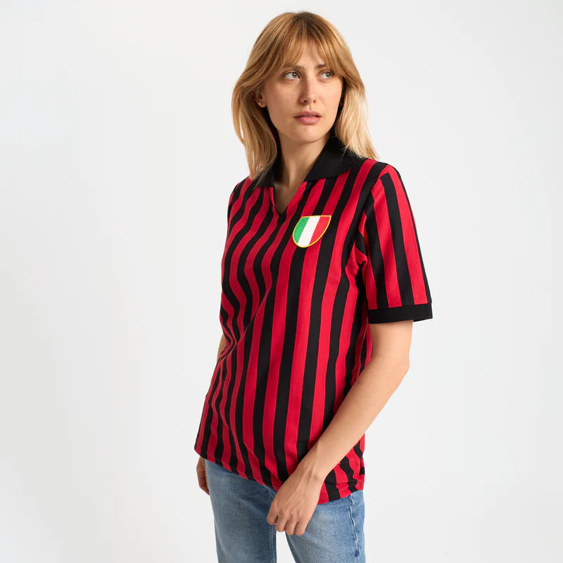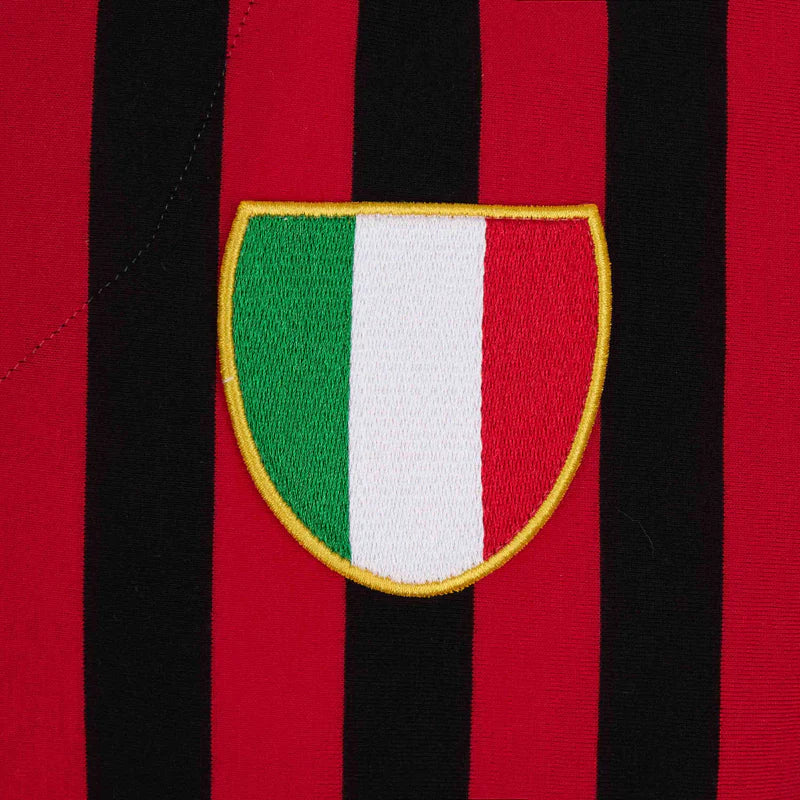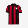 Fantasia a strisce rossonere con colletto nero e scollo a V. Manica corta con polsino nero a costine e spacchetti laterali sul fondo per un look autentico degli anni '60. Stemma tricolore con bordo in tonalità oro ricamato sul petto a sinistra.